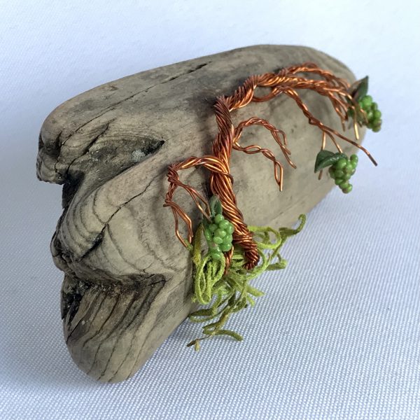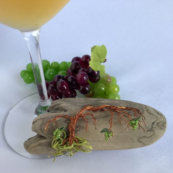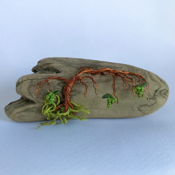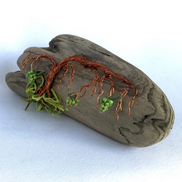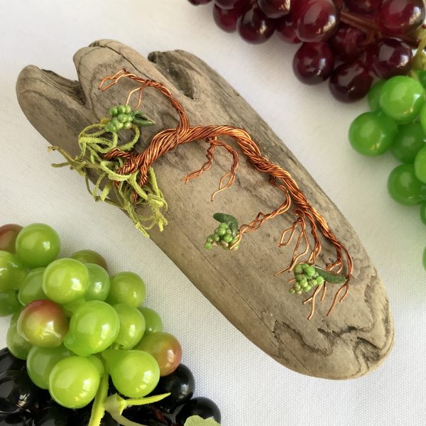 Every vine sculpture is one of a kind. Each wire is carefully bent and positioned to give it its life-like qualities. I collect the driftwood from beaches along the California Coast with the help of friends and family. The magnet is completed with the addition of moss (color may vary) and small polymer clay grape sculptures.
