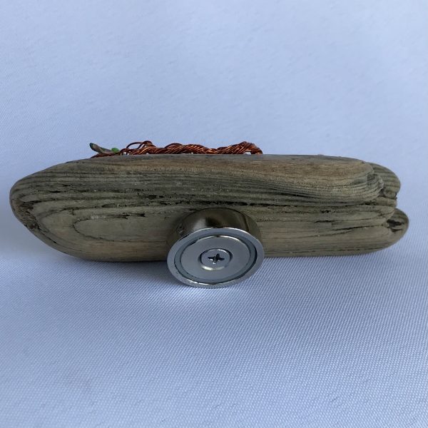 The grapevines are hand sculpted using untreated copper wire. Because the wire is untreated, it will darken over time. The high points can be polished, but the recessed area will continue to tarnish (darken). Therefore, the color and shininess of the metal may vary from the picture. The magnet in the picture is an example. Each piece is made to order an will vary from the picture. Driftwood shape, size, and color will be different than shown.