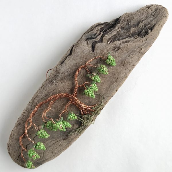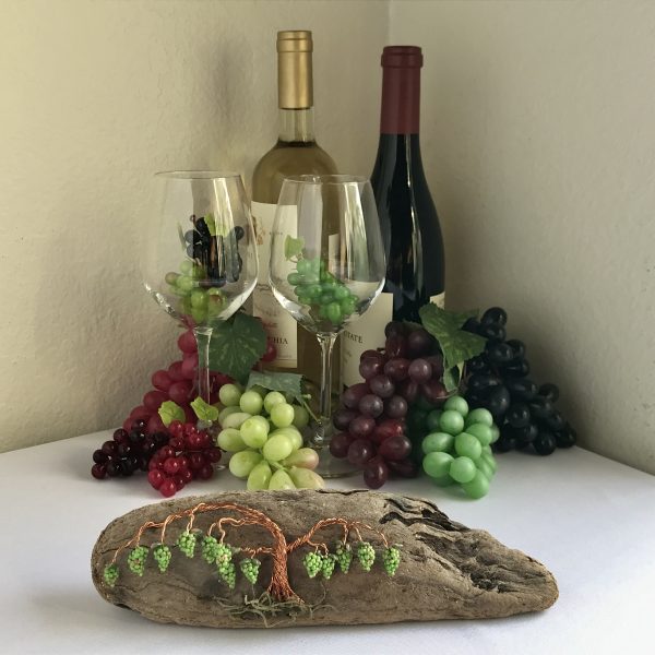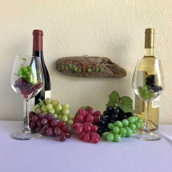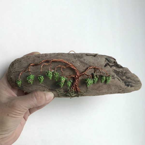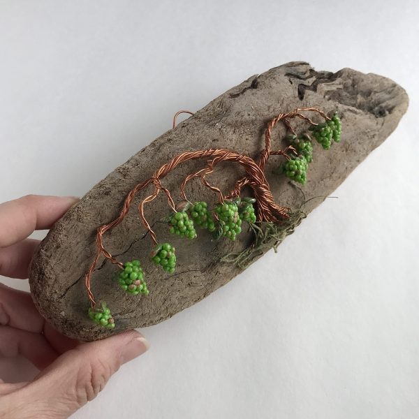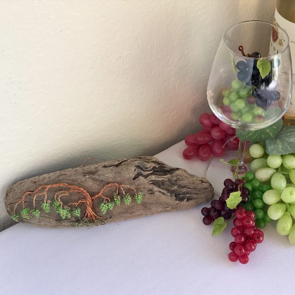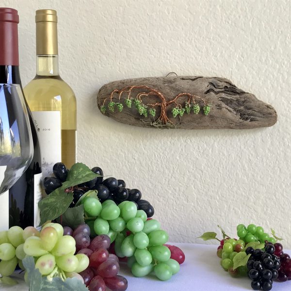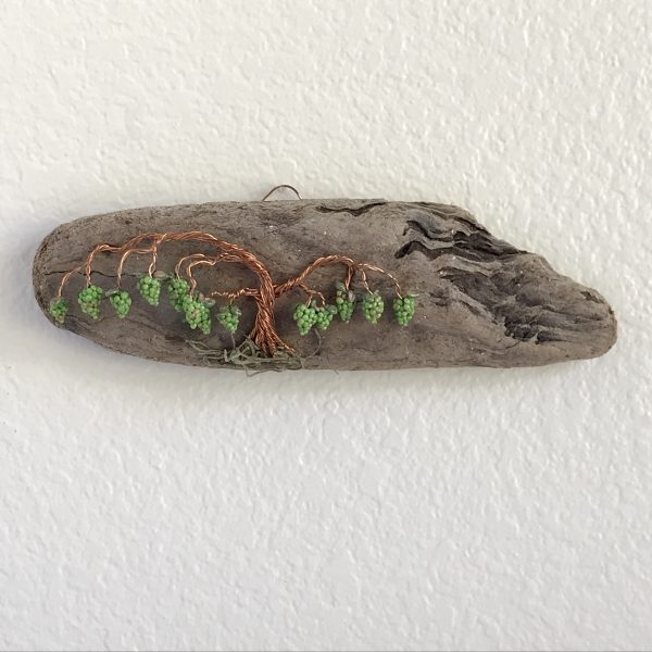Every vine sculpture is one of a kind. Each wire is carefully bent and positioned to give it its life-like qualities. I collect the driftwood from beaches along the California Coast with the help of friends and family. The wall hanging is completed with the addition of moss (color may vary) and small polymer clay grape sculptures.