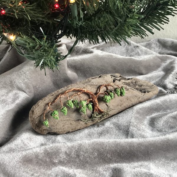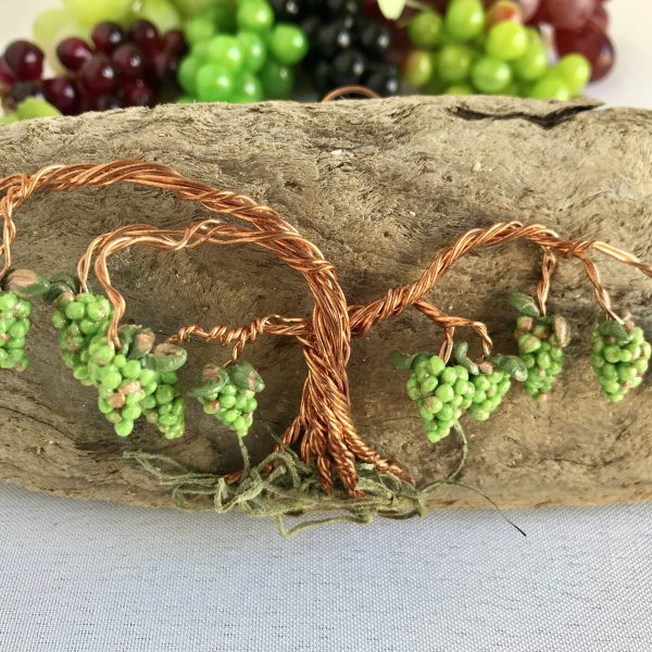 Each grapevine is individual formed, by hand, allowing for the uniqueness and individuality produced in natural growth. Therefore the shape, size, and color of the grapes, leaves, and vine will vary from piece to piece. The polymer clay grapes and leaves were handmade and assembled to create the fruit on the vines.