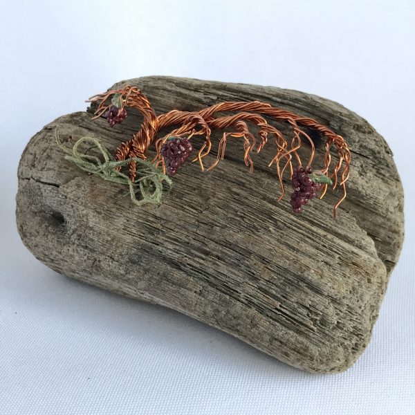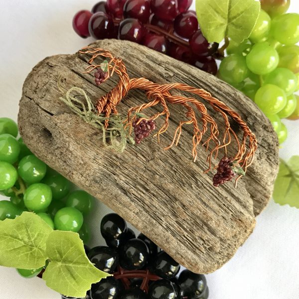 The grapevines are hand sculpted using untreated copper wire.  Because the wire is untreated, it will darken over time.  The high points can be polished, but the recessed area will continue to tarnish (darken).  Therefore, the color and shininess of the metal may vary from the picture.  The magnet in the picture is an example.  Each piece is made to order an will vary from the picture.  Driftwood shape, size, and color will be different than shown.