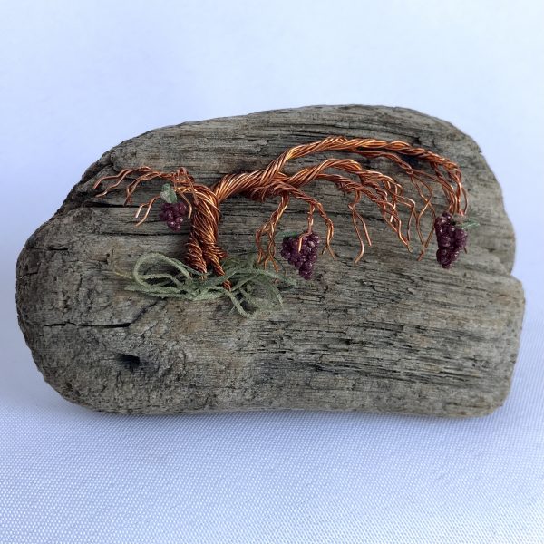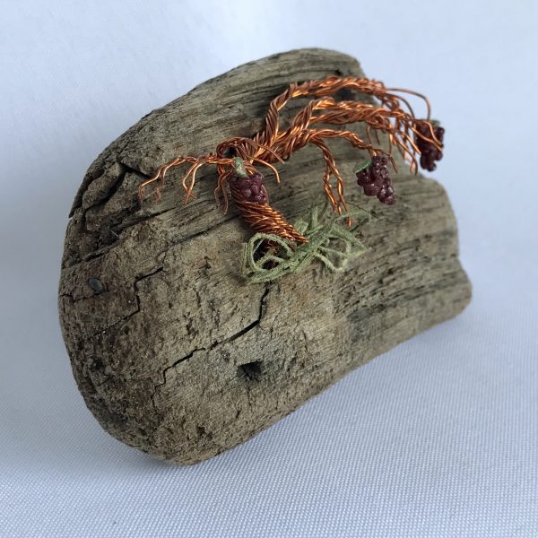 Every vine sculpture is one of a kind.  Each wire is carefully bent and positioned to give it its life-like qualities.  I collect the driftwood from beaches along the California Coast with the help of friends and family.  The magnet is completed with the addition of moss (color may vary) and small polymer clay grape sculptures.