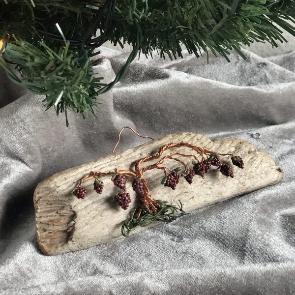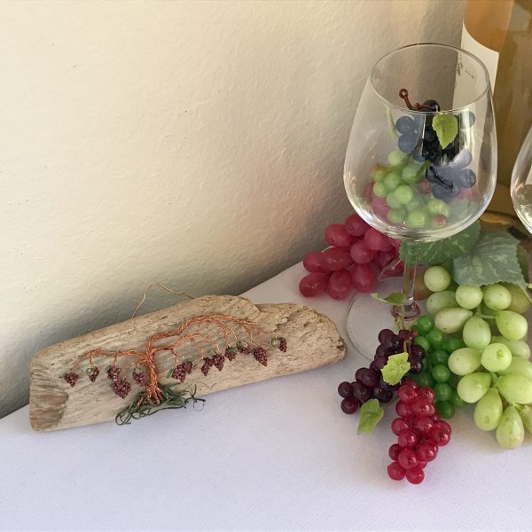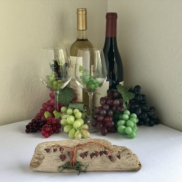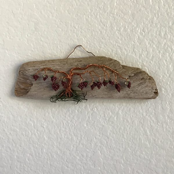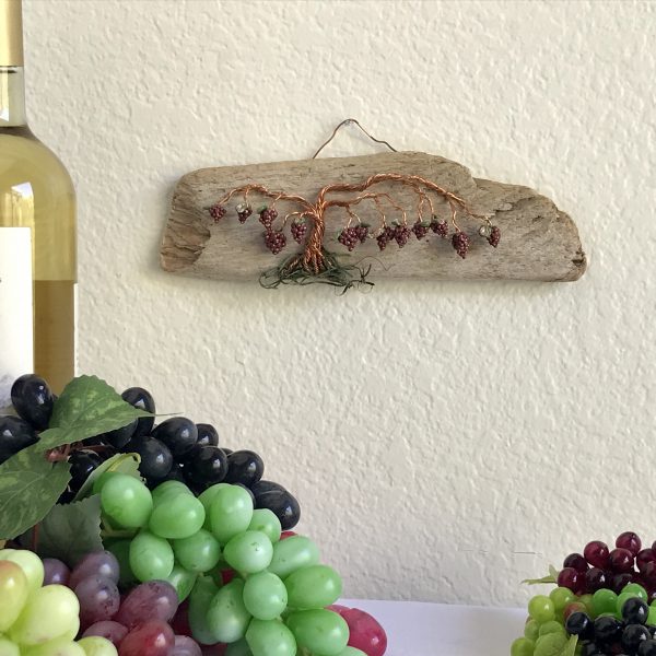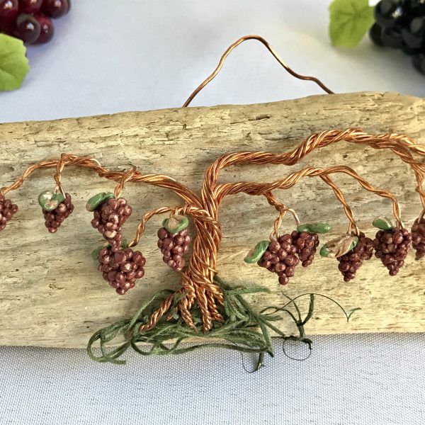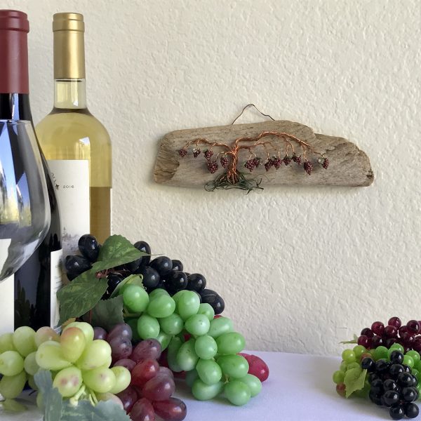 Every vine sculpture is one of a kind. Each wire is carefully bent and positioned to give it its life-like qualities. I collect the driftwood from beaches along the California Coast with the help of friends and family. The wall hanging is completed with the addition of moss (color may vary) and small polymer clay grape sculptures.