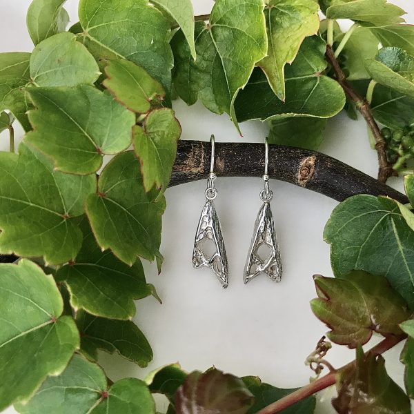 The original Triangle set was cast in sterling silver using a process known as cuttlefish bone casting.  Cuttlefish bone casting is an ancient technique that is fairly simple, but it is often difficult to get the desired results.  The bone in the body of the cuttlefish is slightly flat and oblong.  A piece of this bone is cut in half and sanded so the two pieces fit together smoothly to create the mold.  The design is then carved into one side of the soft cuttlefish bone to create a negative space.  A paintbrush is used to sweep away any debris left in the carved area.  This also helps to emphasize the texture created by the cuttlefish bone.  The two pieces of bone are then bound together with wire to hold them together taut.